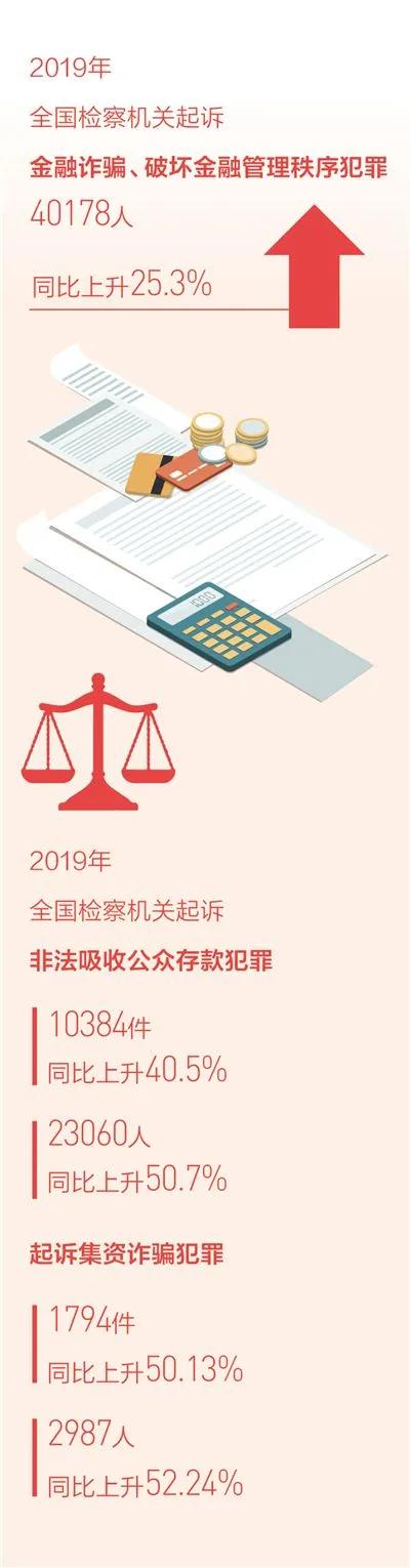 “近年来,金融犯罪呈现持续高发态势,涉众型金融犯罪尤为突出,新类型案件不断增多。”最高人民检察院第四检察厅厅长郑新俭表示,这其中非法吸收公众存款、集资诈骗等非法集资犯罪,特别是利用互联网实施的非法集资犯罪案件持续增加。来自最高检的统计数据显示,2019年,全国检察机关起诉非法吸收公众存款犯罪案件10384件23060人,同比分别上升40.5%和50.7%;起诉集资诈骗犯罪案件1794件2987人,同比分别上升50.13%和52.24%。