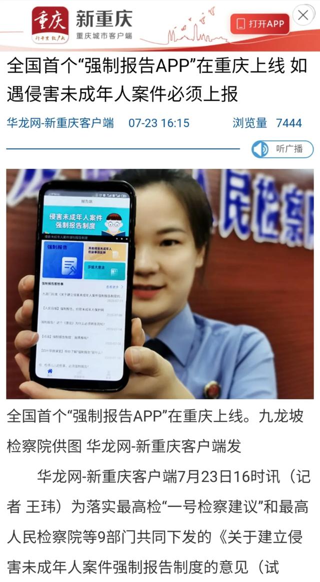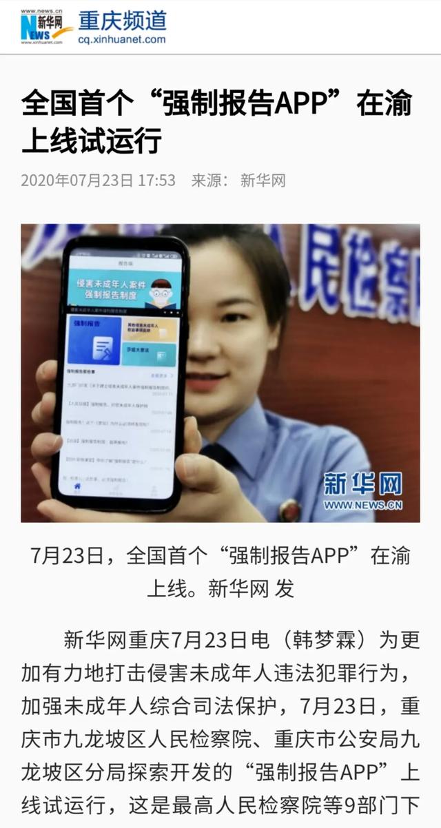 为更加有力地打击侵害未成年人违法犯罪行为,加强未成年人综合司法保护,7月23日,重庆市九龙坡区人民检察院、重庆市公安局九龙坡区分局探索开发的“强制报告APP”上线试运行,这是最高人民检察院等9部门下发《关于建立侵害未成年人案件强制报告制度的意见(试行)》以来全国首个“强制报告APP”,将在九龙坡区试点运用,并逐步推广至全市范围。