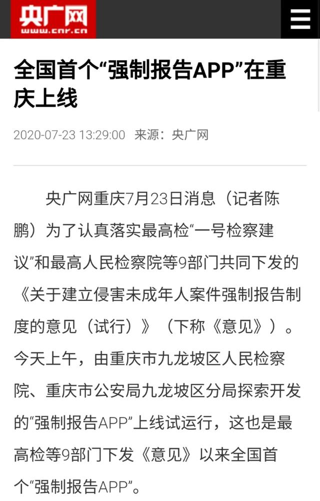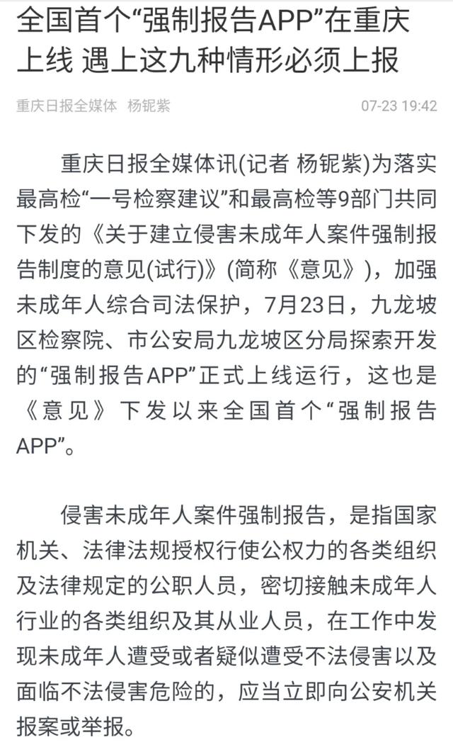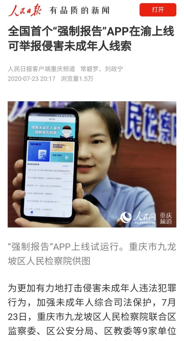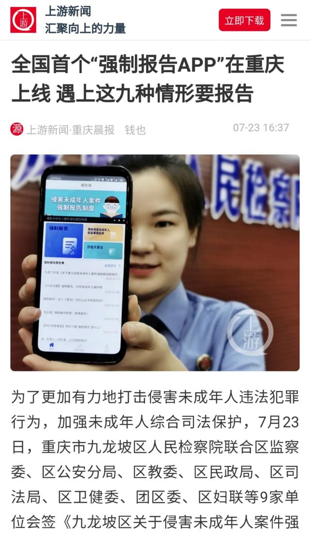 7月23日,重庆市九龙坡区人民检察院、重庆市公安局九龙坡区分局开发的“强制报告App”上线试运行。据悉,这是最高检、团中央等九部门下发《关于建立侵害未成年人案件强制报告制度的意见(试行)》以来,全国首个强制报告App。
