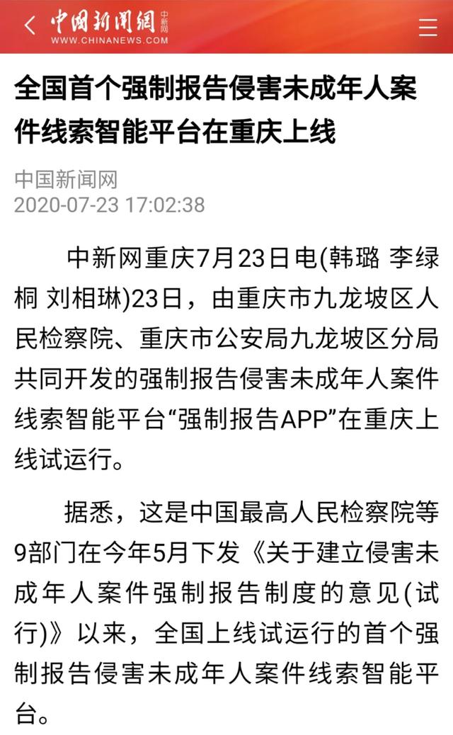 7月23日,由重庆市九龙坡区人民检察院、重庆市公安局九龙坡区分局共同开发的强制报告侵害未成年人案件线索智能平台“强制报告APP”在重庆上线试运行。