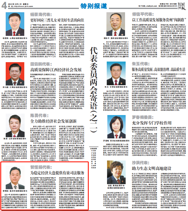 2022年3月4日,《检察日报》第4版“代表委员两会寄语”专栏刊登对全国人大代表、重庆市检察院党组书记、检察长贺恒扬的采访《为稳定经济大盘提供有效司法服务》,内容如下:
