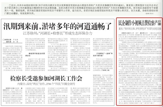2020年7月19日,《检察日报》头版刊登《民企制作小视频点赞检察产品——重庆:“保市场主体、护民营经济”专项行动见实效》一文,内容如下: