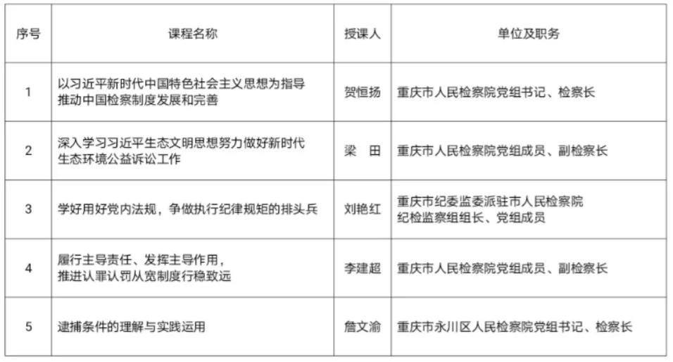 据悉,为推动优质课程和师资资源共建共享,不断提高新时代政法干部教育培训质效,市委政法委此次共确定了富有时代特征、实践特色、政法特点的78门课程,作为全市政法系统首批干部教育培训好课程。由重庆市检察院党组书记、检察长贺恒扬主讲的《以习近平新时代中国特色社会主义思想为指导,推动中国检察制度发展和完善》等16门检察课程入选,其中综合类课程4门、专业类课程12门。