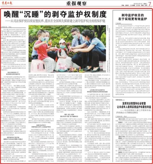 2020年12月2日,《重庆日报》第7版“重报观察”专栏整版刊登《唤醒“沉睡”的剥夺监护权制度——从司法保护到后续安置抚养,重庆在全国率先探索建立剥夺监护权全流程保护链》一文,内容如下: