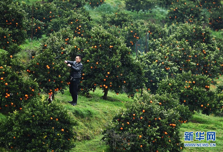 2月13日,26岁的奉节县白帝镇九盘村村民王旭在自家果园里查看脐橙的生长情况。 重庆市奉节县地处长江三峡库区腹心,适宜的气候、土壤、光照、水源等自然条件,为优质脐橙的生长提供了良好环境。近年来,奉节县围绕“农民增收、农业增效、农村增绿”的目标,对脐橙产业进行“精准发展、精细管护、精深加工、精品营销”,不断提升产业效益。截至2018年底,全县脐橙种植面积33万余亩,年产量达30余万吨,成为脱贫增收的支柱产业。 新华社记者王全超摄