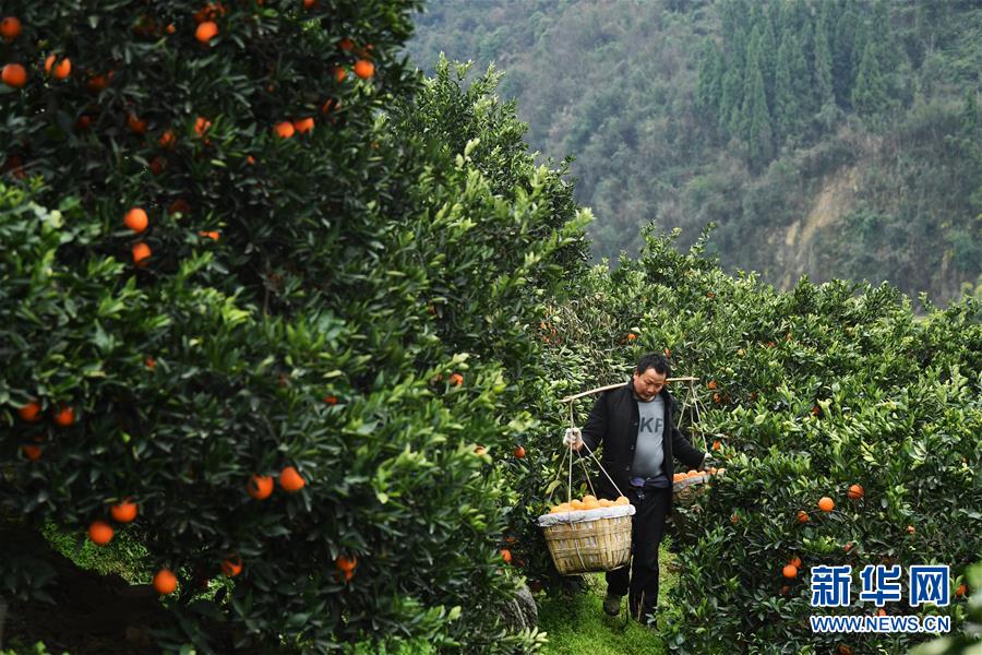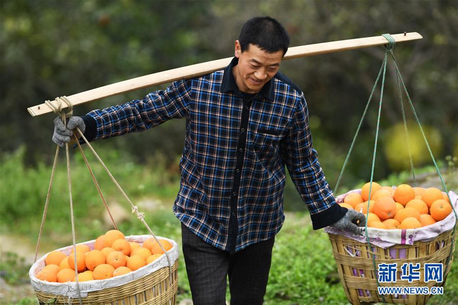 2月13日,奉节县白帝镇黄连村村民在挑运刚采摘的脐橙。 重庆市奉节县地处长江三峡库区腹心,适宜的气候、土壤、光照、水源等自然条件,为优质脐橙的生长提供了良好环境。近年来,奉节县围绕“农民增收、农业增效、农村增绿”的目标,对脐橙产业进行“精准发展、精细管护、精深加工、精品营销”,不断提升产业效益。截至2018年底,全县脐橙种植面积33万余亩,年产量达30余万吨,成为脱贫增收的支柱产业。 新华社记者王全超摄