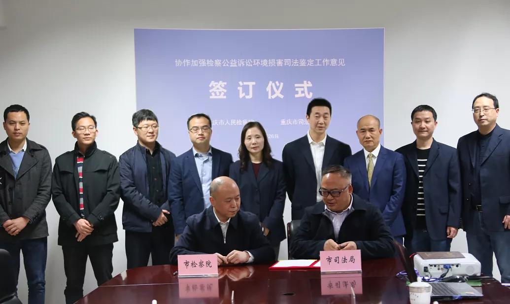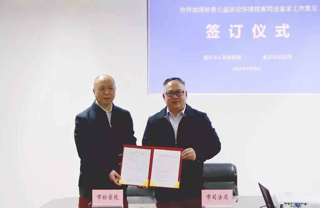 2021年2月26日上午,重庆市检察院和重庆市司法局共同签订了《重庆市人民检察院重庆市司法局关于协作加强检察公益诉讼环境损害司法鉴定工作的意见》。市检察院党组成员、副检察长梁田和市司法局党委委员、副局长陈治元分别代表两部门出席签订仪式并会签该《意见》。