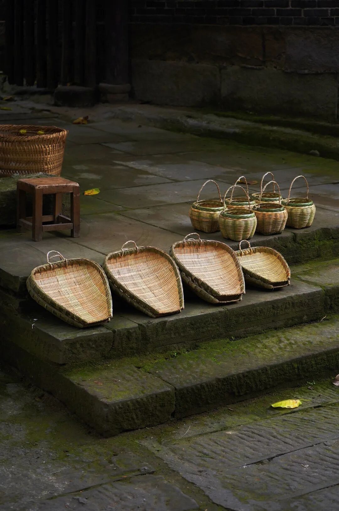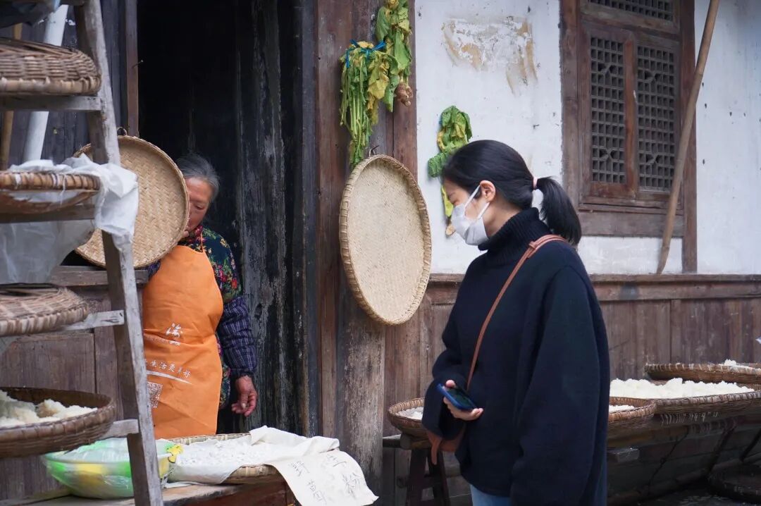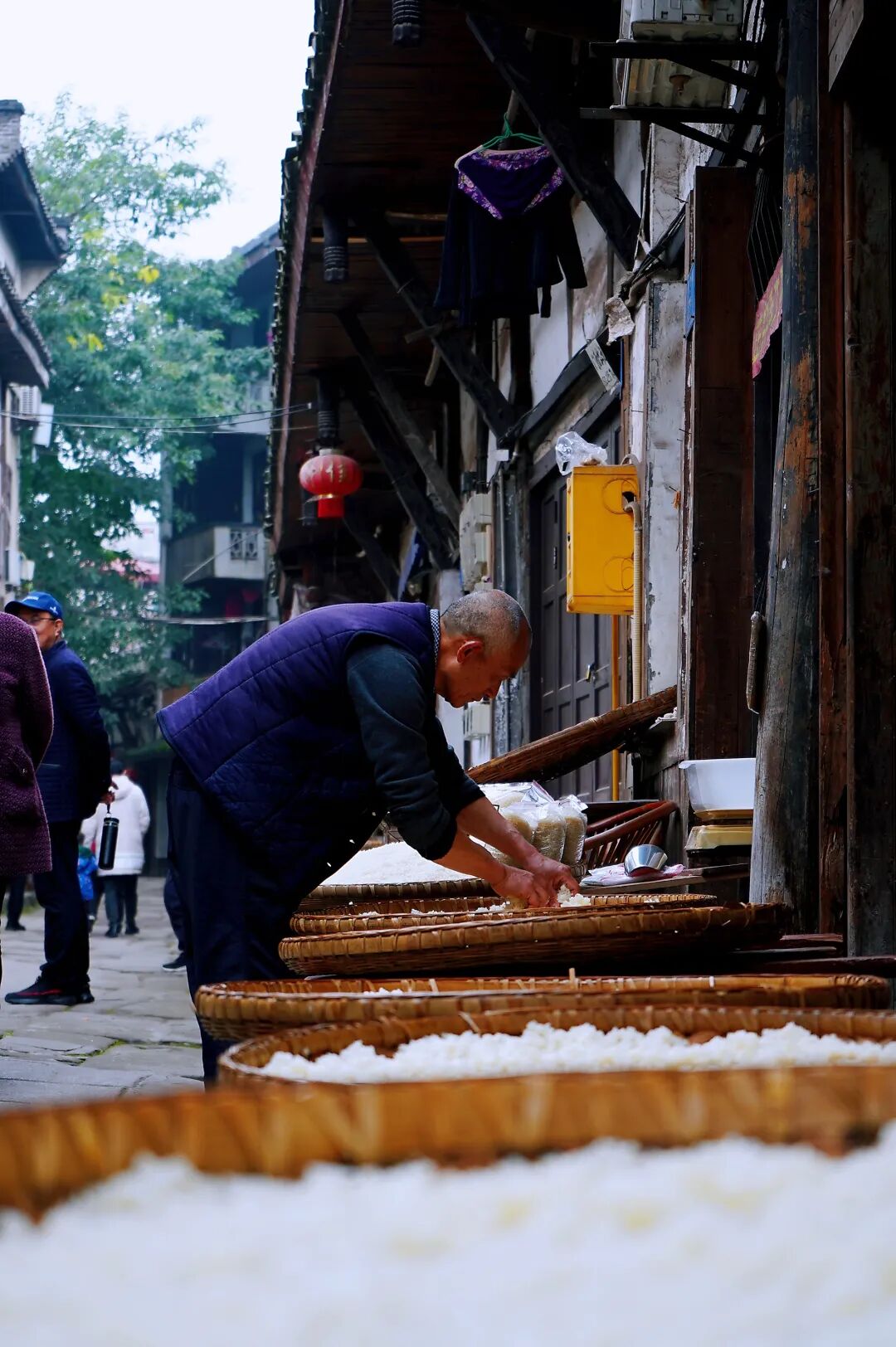 街道两旁晾晒着一排排阴米,屋檐下挂着一串串榨菜,廊下石阶上贩卖着竹篮簸箕等器具。老人不时翻动着簸箕里未干的阴米,匠人坐在廊下,竹篾在手里游走穿行,游人的心似乎也被拨弄着。