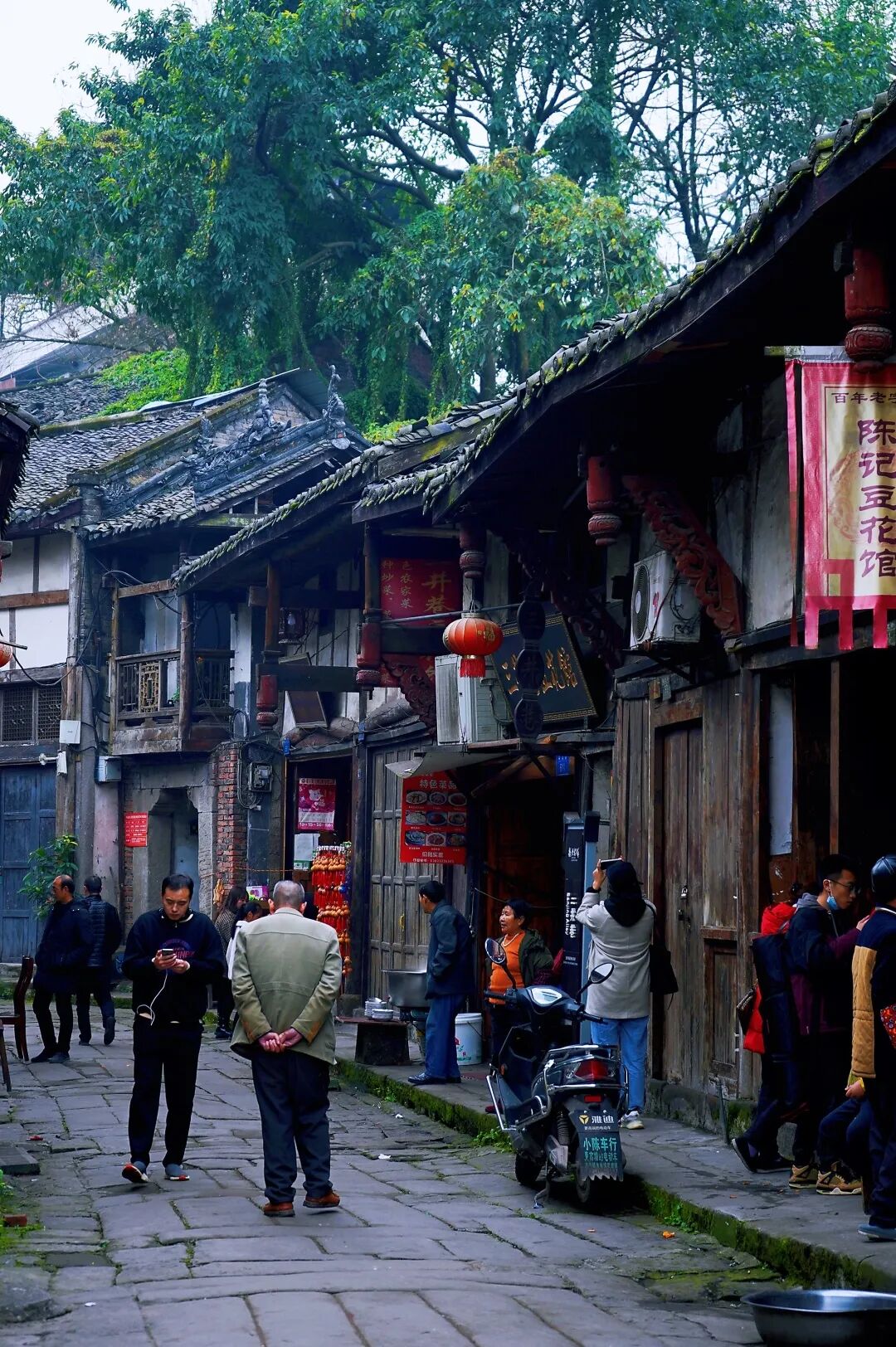 街道两旁多是两三层的穿斗平房,小青瓦盖顶、竹木夹壁、白灰粉墙,这就是古镇居民的住所,一般二楼为住所,一楼前院多为商铺。